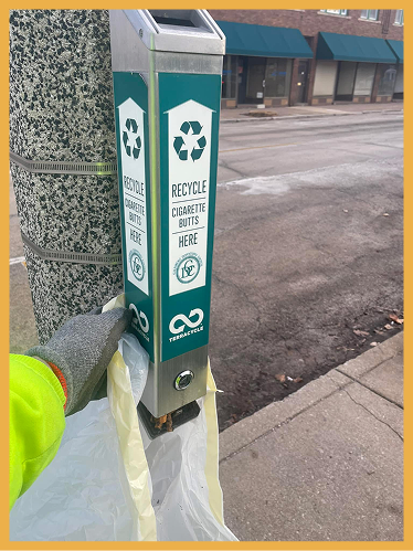 Galesburg Downtown Council utilizes the TerraCycle cigarette butt recycling program with multiple receptacles that look just like this all over the Downtown area. Our Maintenance Team collects the used butts periodically from these receptacles and ships them in to TerraCycle, helping to keep our Downtown looking better, while being socially responsible.
